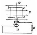 如图所示,有一矩形线圈,面积为S,匝数为N,整个线圈的电阻为r,在磁感应强度为B的匀强磁场中,线圈绕OO′轴以角速度ω匀速转动,外电阻为R。当线圈由图示位置转过900的过程中,下列说法中正确的是![]()