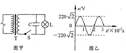 一交流电路如图甲所示,T为理想变压器,原、副线圈的匝数比为11:1,C为电容器,灯炮L的电阻为20
