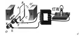 T的水平匀强磁场中,线圈面积S=0.5m2,电阻不计。线框绕垂直于磁场的轴OO′ 以角速度ω=200rad/s匀速转动,线圈中产生的感应电流通过金属滑环E、F与理想变压器原线圈相连,变压器的副线圈线接入一只“220V,60W”灯泡,且灯泡正常发光,下列说法正确的是( )![]()