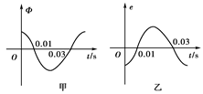 一只矩形线圈在匀强磁场中绕垂直于磁感线的轴匀速转动,穿过线圈的磁通量随时间变化的图象如图甲所示,则下列说法正确的是( )![]()