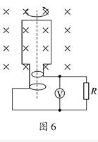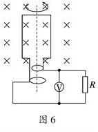 如图6所示,面积为S、匝数为N、电阻为r的线圈与阻值为R的电阻构成闭合回路,理想交流电压表并联在电阻R的两端.线圈在磁感应强度为B的匀强磁场中绕垂直于磁场的转动轴以角速度ω匀速转动.设线圈转动到图示位置的时刻t=0.则( )![]()
