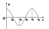 一个矩形线圈绕垂直于匀强磁场并位于线圈平面内的固定轴匀速转动,线圈中的感应电动势e随时间t变化如图所示。则:( )![]()