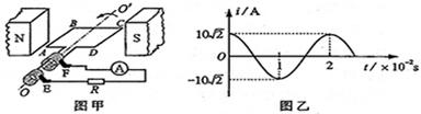 图甲是小型交流发电机的示意图,两磁极N、S间的磁场可视为水平方向的匀强磁场,