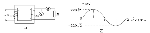 如图甲,一理想变压器原、副线圈匝数比n1∶n2=11∶5,原线圈与正弦交变电源连接,输入电压u随时间t的变化规律如图乙所示,副线圈仅接入一个10 Ω的电阻.则![]()