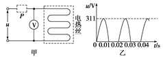 如图(甲)所示,为电热毯的电路图,电热丝接在u="311sin" 100πt V的电源上,电热毯被加热到一定温度后,通过装置P使输入电压变为图(乙)所示的波形,从而进入保温状态,电热丝电阻保持不变,此时交流电压表的读数是( )