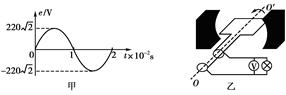 一台小型发电机产生的电动势随时间按正弦变化的规律如图甲所示。已知发电机线圈内阻为5.0 Ω,现外接一只电阻为95.0 Ω的灯泡,如图乙所示,则( ) ![]()