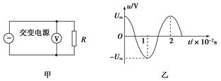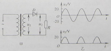 如图所示,理想变压器原线圈接在220V的交流电源上,向一个半波整流电路供电,电阻R的阻值为10Ω,整流前、后的电压波形如图乙所示。下列说法中正确的是![]()