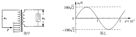 为保证用户电压稳定在220V,变电所需适时进行调压,图甲为调压变压器示意图。保持输入电压U1不变,当滑动接头P上下移动时可改变输出电压。某次检测得到用户电压U2随时间t变化的曲线如图乙所示。以下正确的是 ( )![]()