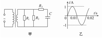 如图甲所示,理想变压器原、副线圈的匝数比为10∶1,R1=20 Ω,R2=30 Ω,C为电容器.已知通过R1的正弦交流电如图乙所示,则( )![]()