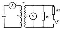 如图所示,T为理想变压器,A为理想交流电流表,V为理想交流电压表,当原线圈两端接电压U=200V的正弦交流电,且S断开时,电压表V的示数为12V,电流表A的示数为0.1A,则 ( )![]()