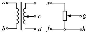 如图所示,左右两个电路中,当a、b两端和e、f两端分别接220V的交变电压时,测得c、d两端和g、h两端的电压均为110V。若分别在c、d两端和g、h两端加上110V交变电压,则a、b两端和e、f两端测得的电压将分别是( )![]()