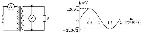 如图甲所示,理想变压器原、副线圈的匝数比为10︰1,电阻R=22Ω,各电表均为理想电表。原线圈输入电压的变化规律如图乙所示。下列说法正确的是![]()
