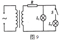 用电高峰期,电灯往往会变暗,其原理可简化为如图9所示的模型.即理想变压器原线圈电压稳定,副线圈上通过输电线连接两只相同的灯泡L1和L2,输电线的等效电阻为R,当开关S闭合时( )