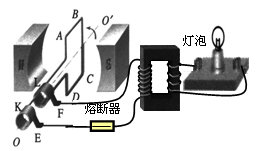 T的水平匀强磁场中,线框面积S=0.5m2,线框电阻不计。线框绕垂直于磁场的轴OO′以角速度ω=100rad/s匀速转动,并与理想变压器原线圈相连,副线圈线接入一只“220V,60W”灯泡,且灯泡正常发光,熔断器允许通过的最大电流为10A,下列说法正确的是 ![]()