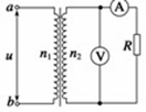 如图所示,理想变压器原、副线圈的匝数比为10∶1,电压表和电流表均为理想电表,R为副线圈的负载电阻.现在原线圈a、b两端加上交变电压u,其随时间变化的规律u=220sin 100πt V,则![]()