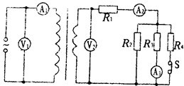 入一交流电源,副线圈电路中R1、R2、R3和R4均为定值电阻,开关S是闭合的.V1和V2为理想电压表,读数分别为U1和U2;A1、A2和A3为理想电流表,读数分别为I1、I2和I3.现断开S,U1数值不变,则下列推断中正确的是![]()