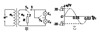 .图甲中理想变压器原、副线圈的匝数之比n1∶n2=5∶1,电阻R=20Ω,L1、L2为规格相同的两只小灯泡,S1为单刀双掷开关。原线圈接正弦交变电源,输入电压u随时间t的变化关系如图乙所示。现将S1接1、S2闭合,此时L2正常发光。下列说法正确的是![]()