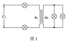 如图所示,电路中有四个完全相同的灯泡,额定电压均为U,额定功率均为P,变压器为理想变压器,现在四个灯泡都正常发光,则变压器的匝数比n1∶n2和电源电压U1分别为 ( )![]()