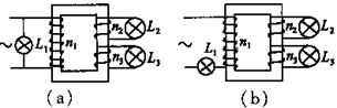 如图所示,两种情况下变压器灯泡L2、L3的功率均 为P,且L1、L2、L3为相同的灯泡,匝数比为n1∶n2=3∶1,则图(a)中L1的功率和图(b)中L1的功率分别为![]()