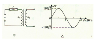 如图甲所示,理想变压器的原线圈电路中装有0.5A的保险丝L,原线圈匝数n1=600匝,副线圈匝数n2=120匝。当原线圈接在如图乙所示的交流电源上,要使整个电路和用电器正常工作,则副线圈两端可以接 ( )![]()