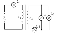 如图所示,理想变压器原、副线圈的匝数比为n1:n2=3:1,L1、L2、L3、L4为四只相同的灯泡,当开关S接通时,L2、L3、L4正常发光,则![]()