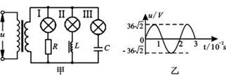 如图甲所示,一个理想变压器原、副线圈的匝数比n1:n2=6:1,副线圈两端接三条支路,每条支路上都接有一只灯泡,电路中L为电感线圈、C为电容器、R为定值电阻.当原线圈两端接有如图乙所示的交流电时,三只灯泡都能发光.如果加在原线圈两端的交流电的最大值保持不变,而将其频率变为原来的2倍,则对于交流电的频率改变之后与改变前相比,下列说法中正确的是 ![]()