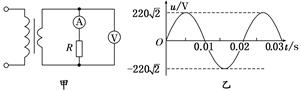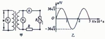 为理想电流表和电压表。若原线圈接入如图乙所示的正弦交变电压,电压表的示数为 110 V,下列表述正确的是( )![]()