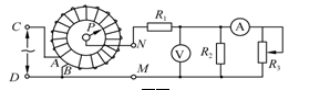 有一种调压变压器的构造如图所示.线圈AB绕在一个圆环形的铁芯上,CD之间加上输入电压,转动滑动触头P就可以调节输出电压.图中A为交流电流表,V为交流电压表, R1、R2为定值电阻,R3为滑动变阻器,CD两端接正弦交流电源,变压器可视为理想变压器:![]()