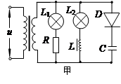 如图甲所示,理想变压器原、副线圈的匝数比 n1:n2=3:1,L1、L2为两相同灯泡,R、L、D和C分别为定值电阻、理想线圈、理想二极管和电容器,其中C = 10