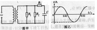 如图甲所示,理想变压器原、副线圈的匝数比为10:1,R1=20Ω,R2=30Ω,C为电容器。已知通过R1的正弦交流电如图乙所示,则( )![]()