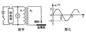 图甲是某燃气炉点火装置的原理图。转换器将直流电压转换为图乙所示的正弦交变电压,并加在一理想变压器的原线圈上,变压器原、副线圈的匝数分别为