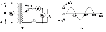 接上一个正弦交变电源,电压随时间变化规律如图乙所示。变压器右侧部分为一火警报警系统原理图,其中