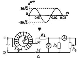 调压变压器就是一种自耦变压器,它的构造如图乙 所示.线圈AB绕在一个圆环形的铁芯上,CD之间输入交变电压,转动滑动触头P就可以调节输出电压.图乙中两电表均为理想交流电表,R1、R2为定值电阻,R3为滑动变阻器. 现在CD两端输入图甲所示正弦式交流电,变压器视为理想变压器,那么( )![]()