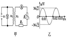 如图甲为理想变压器,其原、副线圈的匝数比为4∶1,电压表和电流表均为理想电表,原线圈接如图乙所示的正弦交流电,图中Rt为NTC型热敏电阻,R1为定值电阻。下列说法正确的是( )![]()