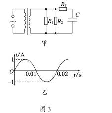 如图3甲所示,理想变压器原、副线圈的匝数比为10∶1,R1=20 Ω,R2=30 Ω,C为电容器,已知通过R1的正弦式电流如图乙所示,则 ( )![]()