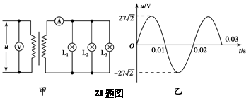 如图甲所示,变压器原副线圈的匝数比为3∶1,L1、L2、L3为三只规格均为“9 V,6 W”的相同灯泡,各电表均为理想交流电表,输入端交变电压u的图象如图乙表示.则以下说法中正确的是( )![]()