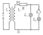 如图所示,理想变压器的副线圈上通过输电线接有两个相同的灯泡L1和L2,输电线的等效电阻为R,开始时,开关S断开。当S接通时,以下说法中正确的是( )![]()