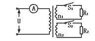 如右图所示,理想变压器有两个副线圈,匝数分别为n1和n2,所接负载4R1=R2。当只闭合S1时,电流表示数为1A,当S1和S2都闭合时,电流表示数为2A,则n1:n2为 。