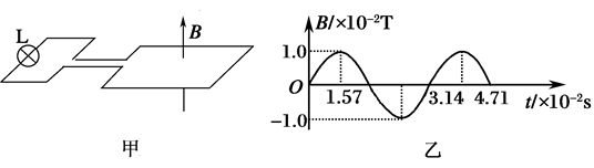 如图所示,一固定的矩形导体线圈水平放置,线圈的两端接一只小灯泡,在线圈所在空间内存在着与线圈平面垂直的均匀分布的磁场.已知线圈的匝数n =100匝,总电阻r=1.0 Ω,所围成矩形的面积S=0.040 m2,小灯泡的电阻R=9.0 Ω,磁感应强度随时间按如图乙所示的规律变化,线圈中产生的感应电动势瞬时值的表达式为e=nBmSωcosωt (V)其中Bm为磁感应强度的最大值,ω=2π/T, T为磁场变化的周期,不计灯丝电阻随温度的变化,求:网