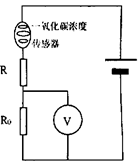 一氧化碳传感器主要用于汽车尾气中一氧化碳浓度的检测。它的电阻随一氧化碳浓度的变化而变化,在如图所示的电路中,不同的一氧化碳浓度对应着传感器的不同电阻,这样,显示仪表的指针就与一氧化碳浓度有了对应关系,观察仪表指针就能判断一氧化碳是否超标。有一种氧化锡传感器,其电阻的倒数与一氧化碳的浓度成正比,那么,电压表示数U与一氧化碳浓度C之间的对应关系正确的是( )![]()
