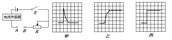 用电流传感器可以清楚的演示一些电学元件对电路中电流的影响。如图4所示,在A、B间分别接入电容器、电感线圈和定值电阻,闭合开关时,计算机显示的电流随时间变化的图象如图甲、乙、丙所示,则下列说法正确的是( )![]()