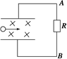 的匀强磁场,磁场中有两块面积为S,相距为d的平行金属板与外电阻R相连构成一电路。设气流的速度为v,气体的电导率(电阻率的倒数)为g,则流过外电阻R的电流强度I及电流方向为( )![]()