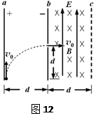 如图所示,竖直放置的两块很大的平行金属板a、b,相距为d,ab间的电场强度为E,今有一带正电的微粒从a板下缘以初速度v0竖直向上射入电场,当它飞到b板时,速度大小不变,而方向变为水平方向,且刚好从高度也为d的狭缝穿过b板而进入bc区域,bc区域的宽度也为d,所加电场大小为E,方向竖直向上,磁感强度方向垂直纸面向里,磁场磁感应强度大小等于E / v0 ,重力加速度为g,则下列关于粒子运动的有关说法正确的是( )![]()