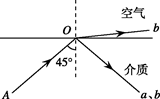 如图所示,细光束AO以45°的入射角从某种介质射向空气时,分成a、b两束,a光频率为ν1,b光频率为v2。关于这两种单色光,下列说法中正确的是![]()