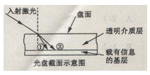 光盘上的信息通常是通过激光束来读取的。若激光束不是垂直入射到盘面上,则光线在进入透明介质层时会发生偏折而改变行进方向。如图所示为一束激光(红光、蓝光混合)入射到光盘盘面上后的折射情况,据此下列判断中正确的是( )![]()