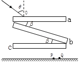 如图所示,a、b和c都是厚度均匀的平行玻璃板,a和b、b和c之间的夹角都为β,一细光束由红光和蓝光组成,以入射角θ从O点射入a板,且射出c板后的两束单色光射在地面上P,Q两点,由此可知( )![]()