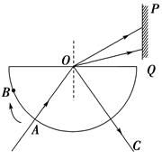 如图,半圆形玻璃砖置于光屏PQ的左下方.一束白光沿半径方向从A点射入玻璃砖,在O点发生反射和折射,折射光在光屏上呈现七色光带.若入射点由A向B缓慢移动,并保持白光沿半径方向入射到O点,观察到各色光在光屏上陆续消失.在光带未完全消失之前,反射光的强度变化以及光屏上最先消失的光分别是![]()