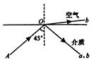 由a.b两种单色光组成的细光束AO以45°的入射角从某种介质射向空气时,光路如图所示。关于这两种单色光,下列说法中正确的是 ( )![]()