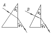 如图所示,两个同种玻璃制成的棱镜,顶角θ1略大于θ2,两单色光A和B分别垂直入射三棱镜,其出射光线与第二界面的夹角φ1 =φ2,则下列说法不正确的是( )![]()