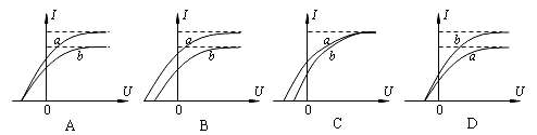 在光电效应实验中,先后用频率相同但光强不同的两束光照射同一个光电管。若实验a中的光强大于实验b中的光强,实验所得光电流I与光电管两端所加电压U间的关系曲线分别以a、b表示,则下列图中可能正确的是( )![]()